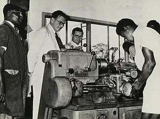 At the beginning of his governorship of the Gold Coast, Guggisberg presented a 10-year development program to the Legislative Council. He suggested first the improvement of transportation.[117] Then, in order of priority, his prescribed improvements included water supply, drainage, hydroelectric projects, public buildings, town improvements, schools, hospitals, prisons, communication lines, and other services.[118] Guggisberg also set a goal of filling half of the colony's technical positions with Africans as soon as they could be trained. His program has been described as the most ambitious ever proposed in West Africa up to that time.[119] Another of the governor's programs led to the development of an artificial harbour at Takoradi, which then became Ghana's first port. Achimota College, which developed into one of the nation's finest secondary schools, was also a Guggisberg idea.[111][120]