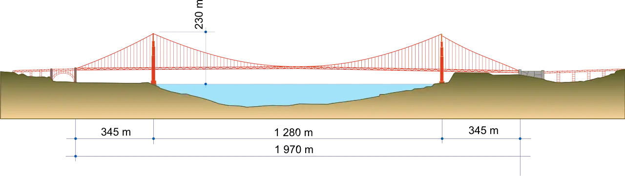 A suspension-bridge design was chosen, using recent advances in bridge design and metallurgy.[12]