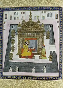 Maharaja Ranjit Singh listening to Guru Granth Sahib being recited near the Akal Takht and Golden Temple, Amritsar, Punjab, India.