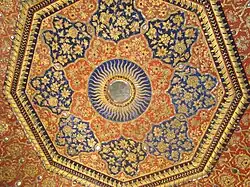 The sanctum has two floors. The Sikh scripture Guru Granth Sahib is seated on the lower square floor for about 20 hours every day, and for 4 hours it is taken to its bedroom inside Akal Takht with elaborate ceremonies in a palki, for sukhasana and Prakash.[34] The floor with the seated scripture is raised a few steps above the entrance causeway level. The upper floor in the sanctum is a gallery and connected by stairs. The ground floor is lined with white marble, as is the path surrounding the sanctum. The sanctum's exterior has gilded copper plates. The doors are gold leaf-covered copper sheets with nature motifs such as birds and flowers. The ceiling of the upper floor is gilded, embossed and decorated with jewels. The sanctum dome is semi-spherical with a pinnacle ornament. The sides are embellished with arched copings and small solid domes, the corners adorning cupolas, all of which are covered with gold leaf-covered gilded copper.[3] There is a pavilion located on the second-floor called the Shish Mahal (mirror room).[43]