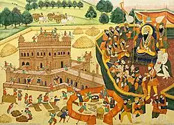Guru Arjan overseeing the construction of the original Golden Temple (Harmandir Sahib), painting from c. 1890–95