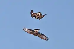 In some parts of the Alps, the golden eagle population has reached the saturation point in appropriate habitat and apparently violent confrontations are more common than in other parts of the range.[93] Golden eagles may express their aggression via body language while perched, typically the adult female when confronted by an intruding eagle: the head and body are upright, feathers on head and neck are erect; the wings may be slightly spread and beak open; often accompanied by intense gaze. They then often engage in a similar posture with wings spread wide and oriented toward the threat; sometimes rocking back on tail and even flopping over onto the back with talons extended upward as defense. Such behavior may be accompanied by wing slap against the threatening intruder.[49] When approached by an intruder, the defending eagle turns away, partially spreads tail, lowers head, and remains still; adults on the nest may lower head and "freeze" when approached by a person or a helicopter.[49] Females in Israel displayed more than males and mostly against interspecific intruders; males apparently displayed primarily as part of courtship.[91] Five of 7 aggressive encounters at carcasses during winter in Norway were won by females; in 15 of 21 conflicts, the younger bird dominated an older conspecific.[94] However, obvious juvenile eagles (apparent to the adult eagles due to the amount of white on their wings and tail) are sometimes allowed to penetrate deeply into a pair's home range and all parties commonly ignore each other.[95][96] In North Dakota, it was verified that parent eagles were not aggressive towards their own young after the nesting period and some juveniles stayed on their parents territory until their 2nd spring and then left by their own accord.[97]
