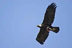 Juvenile golden eagles are similar to adults but tend to be darker, appearing black on the back especially in East Asia. They have a less faded colour. Young birds are white for about two-thirds of their tail length, ending with a broad, black band.[37] Occasionally, juvenile eagles have white patches on the remiges at the bases of the inner primaries and the outer secondaries, forming a crescent marking on the wings which tends to be divided by darker feathers.[4][46] Rarely, juvenile birds may have only traces of white on the tail. Compared to the relatively consistently white tail, the white patches on the wing are extremely variable; some juveniles have almost no white visible. Juveniles of less than 12 months of age tend to have the most white in their plumage.[44] By their second summer, the white underwing coverts are usually replaced by a characteristic rusty brown colour. By the third summer, the upper-wing coverts are largely replaced by dark brown feathers, although not all feathers moult at once which leaves many juvenile birds with a grizzled pattern. The tail follows a similar pattern of maturation to the wings.[44][46] Due to the variability between individuals, juvenile eagles cannot be reliably aged by sight alone.[47] Many golden eagles still have white on the tail during their first attempt at nesting.[48] The final adult plumage is not fully attained until the birds are between 5+1⁄2 and 6+1⁄2 years old.[47]
