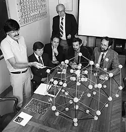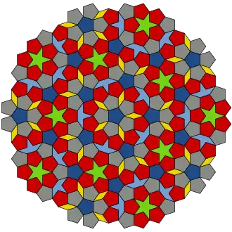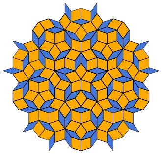 The zome construction system, developed by Steve Baer in the late 1960s, is based on the symmetry system of the icosahedron/dodecahedron, and uses the golden ratio ubiquitously. Between 1973 and 1974, Roger Penrose developed Penrose tiling, a pattern related to the golden ratio both in the ratio of areas of its two rhombic tiles and in their relative frequency within the pattern.[36] This gained in interest after Dan Shechtman's Nobel-winning 1982 discovery of quasicrystals with icosahedral symmetry, which were soon afterwards explained through analogies to the Penrose tiling.[37]