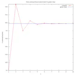 The convergents of these continued fractions, , , , , , , ... or , , , , , , ..., are ratios of successive Fibonacci numbers. The consistently small terms in its continued fraction explain why the approximants converge so slowly. This makes the golden ratio an extreme case of the Hurwitz inequality for Diophantine approximations, which states that for every irrational , there are infinitely many distinct fractions such that,