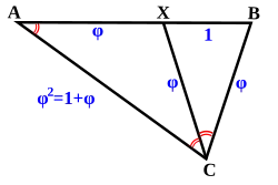 - A circular arc around with radius intersects in point the straight line through points and (also known as the extension of ). The ratio of to the constructed segment is the golden ratio.