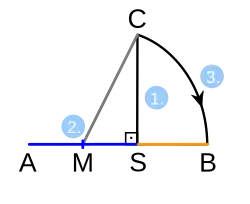 - Having a line segment , construct a perpendicular at point , with half the length of . Draw the hypotenuse .