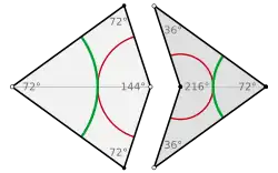 The triangle formed by two diagonals and a side of a regular pentagon is called a golden triangle or sublime triangle. It is an acute isosceles triangle with apex angle and base angles .[48] Its two equal sides are in the golden ratio to its base.[49] The triangle formed by two sides and a diagonal of a regular pentagon is called a golden gnomon. It is an obtuse isosceles triangle with apex angle and base angle . Its base is in the golden ratio to its two equal sides.[49] The pentagon can thus be subdivided into two golden gnomons and a central golden triangle. The five points of a regular pentagram are golden triangles,[49] as are the ten triangles formed by connecting the vertices of a regular decagon to its center point.[50]