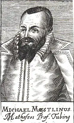 German mathematician Simon Jacob (d. 1564) noted that ratios of consecutive Fibonacci numbers converge to the golden ratio;[25] this was rediscovered by Johannes Kepler in 1608.[26] The first known decimal approximation of the (inverse) golden ratio was stated as "about " in 1597 by Michael Maestlin of the University of Tübingen in a letter to Kepler, his former student.[27] The same year, Kepler wrote to Maestlin of the Kepler triangle, which combines the golden ratio with the Pythagorean theorem. Kepler said of these: