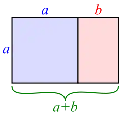 In mathematics, two quantities are in the golden ratio if their ratio is the same as the ratio of their sum to the larger of the two quantities. Expressed algebraically, for quantities and with , is in a golden ratio to if where the Greek letter phi ( or ) denotes the golden ratio.[a] The constant satisfies the quadratic equation and is an irrational number with a value of[1] 1.618033988749.... The golden ratio was called the extreme and mean ratio by Euclid,[2] and the divine proportion by Luca Pacioli;[3] it also goes by other names.[b]