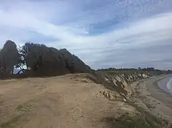 The Goleta Valley is a coastal plain, about 3 mi (4.8 km) across, between the Santa Ynez Mountains, the principal mountain range of southern Santa Barbara County, and the Pacific Ocean.[25] It consists of Holocene and Pleistocene alluvium, colluvium, and estuarine deposits, as well as marine terraces created during interglacial high-sea-level episodes. The area has been subject to rapid geologic uplift, as evidenced by its coastal bluffs and narrow beaches.[25] Between the flattest part of the Goleta Valley and the ocean, an area of uplift parallels the shore, which includes, from west to east, Isla Vista, Mescalitan Island, More Mesa, and the Hope Ranch Hills. The elevation of this block of land relative to Goleta Valley increases from 40 to 300 ft along this length.[26][27] The uplift was caused by motion along the More Ranch Fault, one of the most geologically active faults in the area. The More Ranch Fault roughly follows a line along El Colegio Road, through the southern part of the airport, along Atascadero Creek, and then continues east into Santa Barbara as the Mission Ridge Fault Zone.[28] Soils in Goleta are mostly well-drained, brown, fine, sandy loam of the Milpitas series.[29]