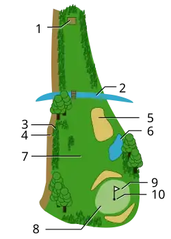 Par is primarily determined by the playing length of each hole from the teeing ground to the putting green. Holes are generally assigned par values between three and five, which includes a regulation number of strokes to reach the green based on the average distance a proficient golfer hits the ball, and two putts.[11] On occasion, factors other than distance are taken into account when setting the par for a hole; these include altitude, terrain and obstacles that result in a hole playing longer or shorter than its measured distance, e.g. route is significantly uphill or downhill, or requiring play of a stroke to finish short of a body of water before hitting over it.[12]