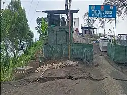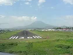 The predominant terrain of Goma is volcanic, with only a small portion consisting of slightly sandy soil.[18] The surface is covered with basalt flows, creating a skeletal soil profile. Hills such as Mount Goma, Mount Ndosho, Mount Mugunga, and Mount Busara punctuate the landscape, although some areas are relatively flat.[20] Mount Goma, an extinct volcano, lies at the public port of Goma. This hill was formed during ancient volcanic eruptions and marks the southeastern limit of the plain.[20]