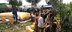 The name Goma derived from a modification of ngoma, the city's former designation, a term of profound cultural and linguistic relevance among Bantu-speaking communities throughout Central, Southern, and East Africa.[10][11][12][13] Ngoma is translated as "drum", and is commonly associated with ritual dances and ceremonies in these regions.[12][13] This etymological link is believed to allude to the resonant, drum-like sounds emitted during a volcanic eruption that altered the area's historical topography.[10] The eruption led to the destruction of the original village, prompting its inhabitants to disperse and establish three new villages: Ngoma, which evolved into modern Goma; Matcha, contemporary Sake; and Munti, which is now known as Munigi groupement of Bukumu Chiefdom.[10]