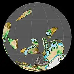 During the Neoproterozoic to Paleozoic phase of the Terra Australis Orogen, a series of terranes were rafted from the proto-Andean margin when the Iapetus Ocean opened, to be added back to Gondwana during the closure of that ocean.[25] During the Paleozoic, some blocks which helped to form parts of the Southern Cone of South America, include a piece transferred from Laurentia when the west edge of Gondwana scraped against southeast Laurentia in the Ordovician.[26] This is the Cuyania or Precordillera terrane of the Famatinian orogeny in northwest Argentina which may have continued the line of the Appalachians southwards.[27] Chilenia terrane accreted later against Cuyania.[28] The collision of the Patagonian terrane with the southwestern Gondwanan occurred in the late Paleozoic. Subduction-related igneous rocks from beneath the North Patagonian Massif have been dated at 320–330 million years old, indicating that the subduction process initiated in the early Carboniferous.[29] This was relatively short-lived (lasting about 20 million years), and initial contact of the two landmasses occurred in the mid-Carboniferous,[29][30] with broader collision during the early Permian.[30] In the Devonian, an island arc named Chaitenia accreted to Patagonia in what is now south-central Chile.[31]