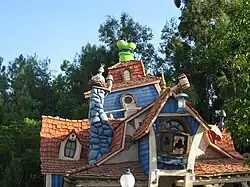In the comics, Goofy usually appears as Mickey's sidekick, though he also is occasionally shown as a protagonist.[7] Goofy lives in Mouseton in the comics and in Spoonerville in Goof Troop. In comics books and strips, Goofy's closest relatives are his smarter nephew Gilbert.[8] and his grandmother, simply called Grandma Goofy.[9] In Italian comics, he has been given several cousins, including adventurer Arizona Goof (original Italian name: Indiana Pipps),[10] who is a spoof of the fictional archaeologist Indiana Jones.
