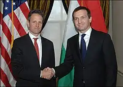 György Gordon Bajnai (Hungarian pronunciation: [ˈɡordon ˈbɒjnɒi]; born 5 March 1968) is a Hungarian entrepreneur and economist, who served as the Prime Minister of Hungary from 2009 to 2010. Prior to that, he functioned as Minister of Local Government and Regional Development from 2007 to 2008, then as Minister of National Development and Economy from 2008 to 2009. In March 2009, following Prime Minister Ferenc Gyurcsány's announced resignation, Bajnai was nominated by the ruling Hungarian Socialist Party (MSZP) to become Hungary's next head of government.[1] Bajnai became prime minister when the parliament passed a constructive motion of no-confidence against Ferenc Gyurcsány on 14 April 2009.[2] He held the office until the formation of the Second Orbán Government following the 2010 parliamentary election.