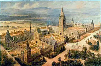 The firm of Cope & Stewardson was an early and important exponent, transforming the campuses of Bryn Mawr College,[133] Princeton University[134] and the University of Pennsylvania in the 1890s.[135] In 1872, Abner Jackson, the President of Trinity College, Connecticut, visited Britain, seeking models and an architect for a planned new campus for the college. William Burges was chosen and he drew up a four-quadrangled masterplan, in his Early French style. Lavish illustrations were produced by Axel Haig.[136] However, the estimated cost, at just under one million dollars, together with the sheer scale of the plans, thoroughly alarmed the College Trustees[137] and only one-sixth of the plan was executed, the present Long Walk, with Francis H. Kimball acting as local, supervising, architect, and Frederick Law Olmsted laying out the grounds.[136] Hitchcock considers the result, "perhaps the most satisfactory of all of [Burges's] works and the best example anywhere of Victorian Gothic collegiate architecture".[138]