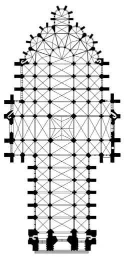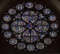 Rayonnant Gothic maximized the coverage of stained glass windows such that the walls are effectively entirely glazed; examples are the nave of Saint-Denis (1231–) and the royal chapel of Louis IX of France on the Île de la Cité in the Seine – the Sainte-Chapelle (c.1241–1248).[27] The high and thin walls of French Rayonnant Gothic allowed by the flying buttresses enabled increasingly ambitious expanses of glass and decorated tracery, reinforced with ironwork.[27] Shortly after Saint-Denis, in the 1250s, Louis IX commissioned the rebuilt transepts and enormous rose windows of Notre-Dame de Paris (1250s for the north transept, 1258 for the beginning of south transept).[40] This first 'international style' was also used in the clerestory of Metz Cathedral (c. 1245–), then in the choir of Cologne's cathedral (c. 1250–), and again in the nave of the cathedral at Strasbourg (c. 1250–).[27] Masons elaborated a series of tracery patterns for windows – from the basic geometrical to the reticulated and the curvilinear – which had superseded the lancet window.[1] Bar-tracery of the curvilinear, flowing, and reticulated types distinguish Second Pointed style.[1]