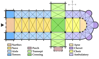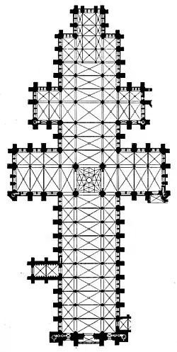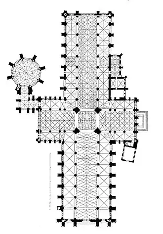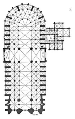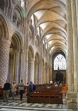 Norman architecture on either side of the English Channel developed in parallel towards Early Gothic.[27] Gothic features, such as the rib vault, had appeared in England, Sicily and Normandy in the 11th century.[27] Rib-vaults were employed in some parts of the cathedral at Durham (1093–)[27] and in Lessay Abbey in Normandy (1098).[28] However, the first buildings to be considered fully Gothic are the royal funerary abbey of the French kings, the Abbey of Saint-Denis (1135–1144), and the archiepiscopal cathedral at Sens (1135–1164). They were the first buildings to systematically combine rib vaulting, buttresses, and pointed arches.[27] Most of the characteristics of later Early English were already present in the lower chevet of Saint-Denis.[1]