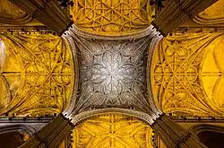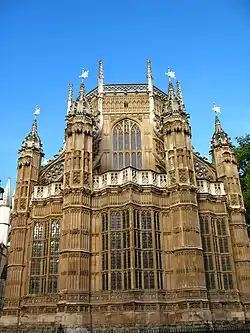 In England, ornamental rib-vaulting and tracery of Decorated Gothic co-existed with, and then gave way to, the perpendicular style from the 1320s, with straightened, orthogonal tracery topped with fan-vaulting.[1][27] Perpendicular Gothic was unknown in continental Europe and unlike earlier styles had no equivalent in Scotland or Ireland.[1][41] It first appeared in the cloisters and chapter-house (c. 1332) of Old St Paul's Cathedral in London by William de Ramsey.[41] The chancel of Gloucester Cathedral (c. 1337–1357) and its latter 14th century cloisters are early examples.[41] Four-centred arches were often used, and lierne vaults seen in early buildings were developed into fan vaults, first at the latter 14th century chapter-house of Hereford Cathedral (demolished 1769) and cloisters at Gloucester, and then at Reginald Ely's King's College Chapel, Cambridge (1446–1461) and the brothers William and Robert Vertue's Henry VII Chapel (c. 1503–1512) at Westminster Abbey.[41][42][43] Perpendicular is sometimes called Third Pointed and was employed over three centuries; the fan-vaulted staircase at Christ Church, Oxford built around 1640.[1][41]
