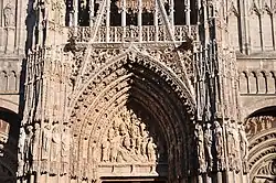 ![]() ![]() ![]() Top: West front of Wells Cathedral in England (1225–1240); middle: Sainte-Chapelle in Paris (1238–1248); bottom: tympanum of Rouen Cathedral (15th century) | |