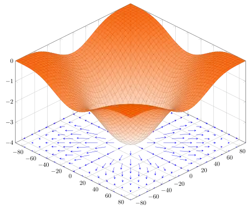 In vector calculus, the gradient of a scalar-valued differentiable function of several variables is the vector field (or vector-valued function) whose value at a point gives the direction and the rate of fastest increase. The gradient transforms like a vector under change of basis of the space of variables of . If the gradient of a function is non-zero at a point , the direction of the gradient is the direction in which the function increases most quickly from , and the magnitude of the gradient is the rate of increase in that direction, the greatest absolute directional derivative.[1] Further, a point where the gradient is the zero vector is known as a stationary point. The gradient thus plays a fundamental role in optimization theory, machine learning, and artificial intelligence, where it is used to minimize a function by gradient descent. In coordinate-free terms, the gradient of a function may be defined by: