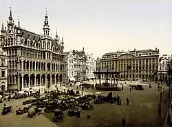 By the late 19th century, a sensitivity arose about the heritage value of the buildings – the turning point was the demolition of the L'Étoile (Dutch: De Sterre) guildhall in 1853 to widen the street on the left of the Town Hall in order to allow the passage of a horse-drawn tramway.[49][52] Under the impulse of the city's then-mayor, Charles Buls, the authorities had the Grand-Place returned to its former splendour, with buildings restored or reconstructed.[4][53][5][6] In 1856, a monumental fountain commemorating the twenty-fifth anniversary of the reign of King Leopold I was installed in the centre of the square.[54] It was replaced in 1864 by a fountain surmounted by statues of the Counts of Egmont and Horn, which was erected in front of the King's House and later moved to the Square du Petit Sablon/Kleine Zavelsquare.[27][55] Thirty years later, during the Belle Époque, a bandstand was raised in its place.[27][56]