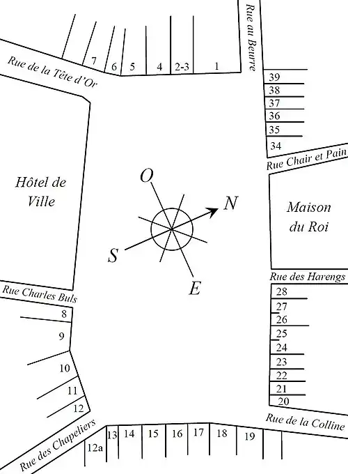 In addition to the name of the respective guild, each house has its own name. The house numbering starts at the northern corner of the square to the left of the Rue au Beurre/Boterstraat in a counter-clockwise direction. The most beautiful houses are probably no. 1 to 7 on the north-western side. On the south-western side, between the Rue de la Tête d'or/Guldenhoofdstraat and Rue Charles Buls/Karel Bulsstraat, are the Town Hall, and the houses no. 8 to 12 to the left of it on the south-eastern side. Still on the south-eastern side, between the Rue des Chapeliers/Hoedenmakersstraat and the Rue de la Colline/Bergstraat, are the houses no. 13 to 19. On the north-eastern side, the King's House, which is located between the Rue des Harengs/Haringstraat and the Rue Chair et Pain/Vlees-en-Broodstraat, is to the right of the houses no. 20 to 28 and to the left of the houses no. 34 to 39.[80]