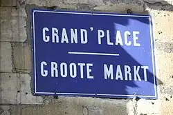 Nowadays, the names Grand-Place[d] (with a hyphen) in French and Grote Markt (with one 'o') in Dutch are most commonly seen. The historical spellings Grand'Place[e] (with an apostrophe) in French and Groote Markt[e] (with a double 'o') in Dutch are outdated,[17][18] but are also still in use in certain sources, such as on wall plaques giving the name of the square. This outdated French spelling is a grammatical exception; place being feminine, the modern French form would be Grande Place. In the Brabantian dialect of Brussels (known as Brusselian, and also sometimes referred to as Marols or Marollien),[19] the Grand-Place is called Gruute Met.[20]