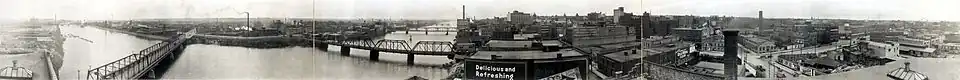 During the second half of the nineteenth century, the city became a major lumbering center, processing timber harvested in the region. Logs were floated down the Grand River to be milled in the city and shipped via the Great Lakes. The city became a center of fine wood products as well. By the end of the century, it was established as the premier furniture-manufacturing city of the United States.[26] It was the Centennial Exposition of 1876 in Philadelphia that brought attention to Grand Rapids' furniture on the national stage, providing a new growing industry to help the city recover from the Panic of 1873.[27][28] In 1880, the country's first hydro-electric generator was put to use on the city's west side.[29]