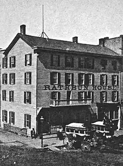 The large framed building constructed by Campau in 1834, seen in this image converted into part of the Rathbun House.