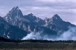 The role of wildfire is an important one for plant and animal species diversity.[129] Many tree species have evolved to mainly germinate after a wildfire. Regions of the park that have experienced wildfire in historical times have greater species diversity after reestablishment than those regions that have not been influenced by fire.[129][130] Though the Yellowstone fires of 1988 had minimal impact on Grand Teton National Park, studies conducted before and reaffirmed after that event concluded that the suppression of natural wildfires during the middle part of the 20th century decreased plant species diversity and natural regeneration of plant communities. One study conducted 15 years before the 1988 Yellowstone National Park fires concluded that human suppression of wildfire had adversely impacted Aspen tree groves and other forest types.[131] The majority of conifer species in Grand Teton National Park are heavily dependent on wildfire and this is particularly true of the Lodgepole Pine.[132] Though extremely hot canopy or crown fires tend to kill Lodgepole Pine seeds, lower severity surface fires usually result in a higher post-wildfire regeneration of this species.[133] In accordance with a better understanding of the role wildfire plays in the environment, the National Park Service and other land management agencies have developed Fire Management Plans which provide a strategy for wildfire management and are expected to best enhance the natural ecosystem.[134]
