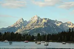 The first U.S. Government-sponsored expedition to enter Jackson Hole was the 1859–60 Raynolds Expedition. Led by U.S. Army Captain William F. Raynolds and guided by mountain man Jim Bridger, it included naturalist F. V. Hayden, who later led other expeditions to the region.[18] The expedition had been charged with exploring the Yellowstone region, but encountered difficulties crossing mountain passes due to snow. Bridger ended up guiding the expedition south over Union Pass then following the Gros Ventre River drainage to the Snake River and leaving the region over Teton Pass.[19] Organized exploration of the region was halted during the American Civil War but resumed when F. V. Hayden led the well-funded Hayden Geological Survey of 1871. In 1872, Hayden oversaw explorations in Yellowstone, while a branch of his expedition known as the Snake River Division was led by James Stevenson and explored the Teton region. Along with Stevenson was photographer William Henry Jackson who took the first photographs of the Teton Range.[9] The Hayden Geological Survey named many of the mountains and lakes in the region.[20] The explorations by early mountain men and subsequent expeditions failed to identify any sources of economically viable mineral wealth. Nevertheless, small groups of prospectors set up claims and mining operations on several of the creeks and rivers. By 1900 all organized efforts to retrieve minerals had been abandoned.[21] Though the Teton Range was never permanently inhabited, pioneers began settling in the Jackson Hole valley to the east of the range in 1884.[22] These earliest homesteaders were mostly single men who endured long winters, short growing seasons and rocky soils that were hard to cultivate. The region was most suited for the cultivation of hay and cattle ranching. By 1890, Jackson Hole had an estimated permanent population of 60.[23] Menor's Ferry was built in 1892 near present-day Moose, Wyoming to provide access for wagons to the west side of the Snake River.[24] Ranching increased significantly from 1900 to 1920, but a series of agricultural related economic downturns in the early 1920s left many ranchers destitute.[25] Beginning in the 1920s, the automobile provided faster and easier access to areas of natural beauty and old military roads into Jackson Hole over Teton and Togwotee Passes were improved to accommodate the increased vehicle traffic. In response to the increased tourism, dude ranches were established, some new and some from existing cattle ranches, so urbanized travelers could experience the life of a cowboy.[26]