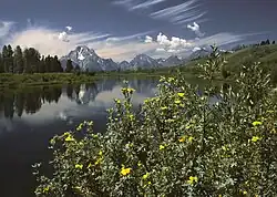 Grand Teton National Park and the surrounding region host over 1,000 species of vascular plants.[96] With an altitude range of over 7,000 ft (2,100 m), the park has a number of different ecological zones including alpine tundra, the Rocky Mountains subalpine zone where spruce-fir forests are dominant, and the valley floor, where a mixed conifer and deciduous forest zone occupies regions with better soils intermixed with sagebrush plains atop alluvial deposits.[97] Additionally, wetlands near some lakes and in the valley floor adjacent to rivers and streams cover large expanses, especially along the Snake River near Oxbow Bend near Moran and Willow Flats near the Jackson Lake Lodge.[98] Altitude, available soils, wildfire incidence, avalanches and human activities have a direct impact on the types of plant species in an immediate area.[99] Where these various niches overlap is known as an ecotone.[100]