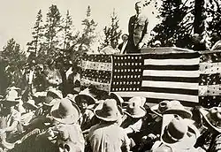 The valley of Jackson Hole remained primarily in private ownership when John D. Rockefeller Jr. and his wife visited the region in the late 1920s.[28] Horace Albright and Rockefeller discussed ways to preserve Jackson Hole from commercial exploitation, and in consequence, Rockefeller started buying Jackson Hole properties through the Snake River Land Company to later turn them over to the National Park Service. In 1930, this plan was revealed to the residents of the region and was met with strong disapproval.[28] Congressional efforts to prevent the expansion of Grand Teton National Park ended up putting the Snake River Land Company's holdings in limbo. By 1942 Rockefeller had become increasingly impatient that his purchased property might never be added to the park, and wrote to the Secretary of the Interior Harold L. Ickes that he was considering selling the land to another party.[33] Secretary Ickes recommended to President Franklin Roosevelt that the Antiquities Act, which permitted presidents to set aside land for protection without the approval of Congress, be used to establish a national monument in Jackson Hole. Roosevelt created the 221,000-acre (89,000 ha) Jackson Hole National Monument in 1943, using the land donated from the Snake River Land Company and adding additional property from Teton National Forest.[34] The monument and park were adjacent to each other and both were administered by the National Park Service, but the monument designation ensured no funding allotment, nor provided a level of resource protection equal to the park. Members of Congress repeatedly attempted to have the new national monument abolished.[35]