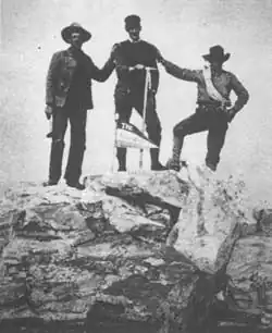During the last 25 years of the 19th century, the mountains of the Teton Range became a focal point for explorers wanting to claim the first ascents of the peaks. However, white explorers may not have been the first to climb many of the peaks and the earliest first ascent of even the formidable Grand Teton itself might have been achieved long before written history documented it. Native American relics remain including The Enclosure, a human-made structure that is located about 530 ft (160 m) below the summit of Grand Teton at a point near the Upper Saddle (13,160 ft (4,010 m)).[39][40] Nathaniel P. Langford and James Stevenson, both members of the Hayden Geological Survey of 1872, found The Enclosure during their early attempt to summit Grand Teton. Langford claimed that he and Stevenson climbed Grand Teton, but were vague as to whether they had made it to the summit. Their reported obstacles and sightings were never corroborated by later parties. Langford and Stevenson likely did not get much further than The Enclosure.[9] The first ascent of Grand Teton that is substantiated was made by William O. Owen, Frank Petersen, John Shive and Franklin Spencer Spalding on August 11, 1898.[39] Owen had made two previous attempts on the peak and after publishing several accounts of this first ascent, discredited any claim that Langford and Stevenson had ever reached beyond The Enclosure in 1872. The disagreement over which party first reached the top of Grand Teton may be the greatest controversy in the history of American mountaineering.[9] After 1898 no other ascents of Grand Teton were recorded until 1923.[41]