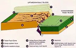 Jackson Hole is a 55-mile-long (89 km) by 6 to 13 miles (9.7 to 20.9 km) wide graben valley with an average elevation of 6,800 ft (2,100 m), its lowest point is near the southern park boundary at 6,350 ft (1,940 m).[78] The valley sits east of the Teton Range and is vertically displaced downward 30,000 ft (9,100 m), making the Teton Fault and its parallel twin on the east side of the valley normal faults with the Jackson Hole block being the hanging wall and the Teton Mountain block being the footwall.[79] Grand Teton National Park contains the major part of both blocks. Erosion of the range provided sediment in the valley so the topographic relief is only 7,700 ft (2,300 m).[69] Jackson Hole is comparatively flat, with only a modest increase in altitude south to north; however, a few isolated buttes such as Blacktail Butte and hills including Signal Mountain dot the valley floor.[75] In addition to a few outcroppings, the Snake River has eroded terraces into Jackson Hole. Southeast of Jackson Lake, glacial depressions known as kettles are numerous. The kettles were formed when ice situated under gravel outwash from ice sheets melted as the glaciers retreated.[80]