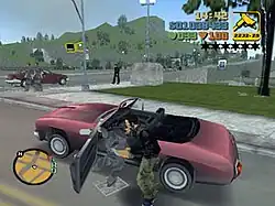 Grand Theft Auto clones allow players to freely explore the game world,[5] which is typically on the scale of an entire city. Some games base their level design on real world cities, such as London, New York City, and Los Angeles.[5] Players are usually able to navigate by vehicle or on foot.[29][30] Some games put greater emphasis on leaping, climbing,[5] and even swimming.[31] Exploring the world is not just necessary to complete objectives, but also to gain valuable items, weapons, and vehicles. Different parts of the game world may be controlled by different enemy factions, who will attempt to stop the player in a variety of ways.[17] More recent games in this genre allow players to acquire their own territory.[8][32] The freedom of navigating a huge game world may be overwhelming or confusing for new players.[17] Game designers have come up with a variety of navigational aids to solve this problem. A mini-map feature is common,[33] while Saints Row and Grand Theft Auto IV go so far as to offer a GPS service.[25] Games without these navigation tools are sometimes criticized as confusing.[5]