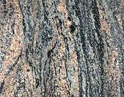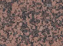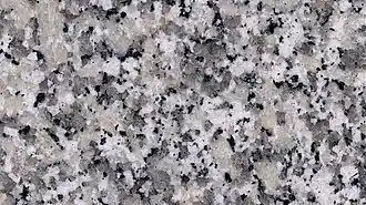 The word "granite" comes from the Latin granum, a grain, in reference to the coarse-grained structure of such a completely crystalline rock.[2] Granites can be predominantly white, pink, or gray in colour, depending on their mineralogy. Granitic rocks mainly consist of feldspar, quartz, mica, and amphibole minerals, which form an interlocking, somewhat equigranular matrix of feldspar and quartz with scattered darker biotite mica and amphibole (often hornblende) peppering the lighter colour minerals. Occasionally some individual crystals (phenocrysts) are larger than the groundmass, in which case the texture is known as porphyritic. A granitic rock with a porphyritic texture is known as a granite porphyry. Granitoid is a general, descriptive field term for lighter-coloured, coarse-grained igneous rocks. Petrographic examination is required for identification of specific types of granitoids.[3] The alkali feldspar in granites is typically orthoclase or microcline and is often perthitic. The plagioclase is typically sodium-rich oligoclase. Phenocrysts are usually alkali feldspar.[4]