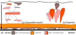 Of these two mechanisms, Stokes diapirism has been favoured for many years in the absence of a reasonable alternative. The basic idea is that magma will rise through the crust as a single mass through buoyancy. As it rises, it heats the wall rocks, causing them to behave as a power-law fluid and thus flow around the intrusion allowing it to pass without major heat loss.[45] This is entirely feasible in the warm, ductile lower crust where rocks are easily deformed, but runs into problems in the upper crust which is far colder and more brittle. Rocks there do not deform so easily: for magma to rise as a diapir it would expend far too much energy in heating wall rocks, thus cooling and solidifying before reaching higher levels within the crust.