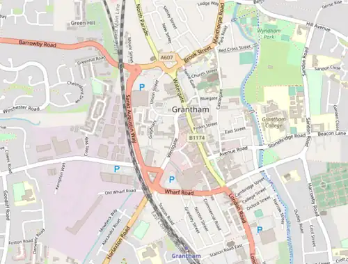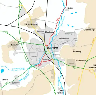Grantham is a town in the South Kesteven district of Lincolnshire, a non-metropolitan county in the East Midlands of England.[69] Until 1974, it was a borough;[70] it is now a civil parish and bounded by the parishes of Great Gonerby to the north-west, Belton and Manthorpe to the north, Londonthorpe and Harrowby Without to the north-east and east, Little Ponton and Stroxton to the south, Harlaxton to the south-west, and Barrowby to the west. Its urban area is almost entirely within the parish,[69] though The Spinney housing estate, Alma Park industrial estate and part of the Bridge End Road housing estate are in Londonthorpe and Harrowby Without.[71]