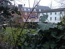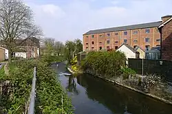 The town lies in the valley of the River Witham, its core at the Witham's confluence with the Mowbeck (or Mow Beck).[7] The Witham flows south–north through Grantham.[72] The Mowbeck, which rises from springs at Harlaxton about 3 miles (4.8 km) to the south-west of the town,[73] is culverted behind Westgate and Brook Street[7] until it joins the Witham at White Bridge.[74]