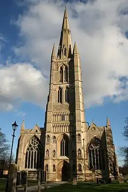 Its lords encouraged Grantham to expand as a commercial centre.[29] By the late 11th century, it was an "important market town".[30] The wool trade prospered, benefiting from its proximity to grazing lands on the Lincoln Heath. This wealth contributed towards the building of St Wulfram's Church.[31] Wool shops were in Grantham in 1218[31] and Walkergate (now Watergate) was recorded in 1257, indicating the presence of fullers (walkers), who played a role in processing wool. Cloth manufacture declined around this time, but wool continued to be produced for trading, primarily for export from Boston. Wool merchants are recorded from the town in the late 13th century (foremost being was Roger de Belvoir, who contributed over £296 to the Wool Prize of 1297). By this time, merchants from Italy,[32] Saint-Omer and Amiens were active in the town.[33]