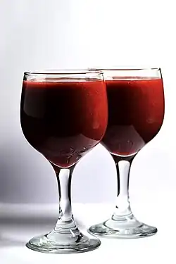 Grape juice is obtained from crushing and blending grapes into a liquid. The juice is often sold in stores or fermented and made into wine, brandy, or vinegar.[28] Grape juice that has been pasteurized, removing any naturally occurring yeast, will not ferment if kept sterile, and thus contains no alcohol. In the wine industry, grape juice that contains 7–23% of pulp, skins, stems and seeds is often referred to as "must".[28]