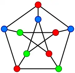 A proper vertex coloring of the Petersen graph with 3 colors, the minimum number possible.