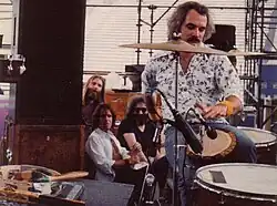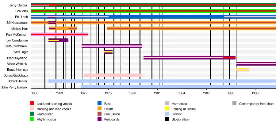 The Grateful Dead was founded in the San Francisco Bay Area during the rise of the counterculture of the 1960s.[9][10][11][12] The band's founding members were Jerry Garcia (lead guitar and vocals), Bob Weir (rhythm guitar and vocals), Phil Lesh (bass guitar and vocals), Bill Kreutzmann (drums), and Ron "Pigpen" McKernan (keyboards, harmonica, and vocals).[13] With the exception of Pigpen, who died in 1973, the remaining founding members stayed with the band until their 1995 split,[14] with subsequent members being Mickey Hart (drums, 1967 to 1971 and 1974 to 1995), Robert Hunter (non-performing lyricist, 1967 to 1995), Tom Constanten (keyboards, 1968 to 1970), John Perry Barlow (non-performing lyricist, 1971 to 1995),[15] Keith Godchaux (keyboards and vocals, 1971 to 1979), Donna Godchaux (vocals, 1972 to 1979), Brent Mydland (keyboards and vocals, 1979 to his death in 1990), and Vince Welnick (keyboards and vocals, 1990 to 1995).[16]