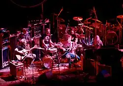 The Grateful Dead was an American rock band formed in Palo Alto, California, in 1965.[1][2] Known for their eclectic style that fused elements of rock, blues, jazz, folk, country, bluegrass, rock and roll, gospel, reggae, and world music with psychedelia,[3][4] the band is famous for improvisation during their live performances,[5][6] and for their devoted fan base, known as "Deadheads". According to the musician and writer Lenny Kaye, the music of the Grateful Dead "touches on ground that most other groups don't even know exists".[7] For the range of their influences and the structure of their live performances, the Grateful Dead are considered "the pioneering godfathers of the jam band world".[8]