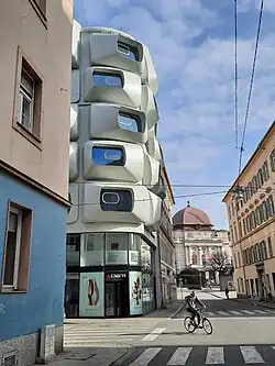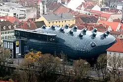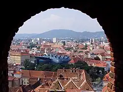 View from the Castle Hill (Schlossberg) Graz City Hall Graz Museum of Contemporary Art Island in the Mur University of Graz | |