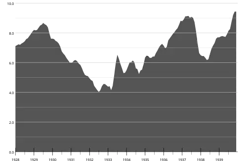In most countries of the world, recovery from the Great Depression began in 1933.[8] In the U.S., recovery began in early 1933,[8] but the U.S. did not return to 1929 GNP for over a decade and still had an unemployment rate of about 15% in 1940, albeit down from the high of 25% in 1933.